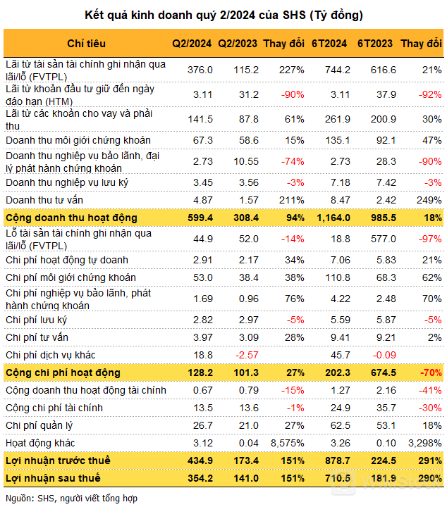 CTCP Chứng khoán Sài Gòn - Hà Nội (HNX: SHS) vừa công bố kết quả quý 2/2024 ghi nhận hơn 354 tỷ đồng lãi ròng, tăng 151% so với cùng kỳ. Trong đó, các mảng hoạt động chính như môi giới, tự doanh và cho vay đều khởi sắc.