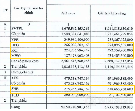 Đối với danh mục tài sản FVTPL, Công ty đã giảm lượng trái phiếu xuống 1,086 tỷ đồng, giảm 23% so với đầu năm. Còn danh mục cổ phiếu có giá gốc 3,589 tỷ đồng, về quy mô không biến động nhiều so với đầu năm nhưng đang tạm lãi gần 10%. Trong đó, FRT, MWG, HPG là các khoản sinh lời tốt nhất, ngược lại phải gồng lỗ VPB.