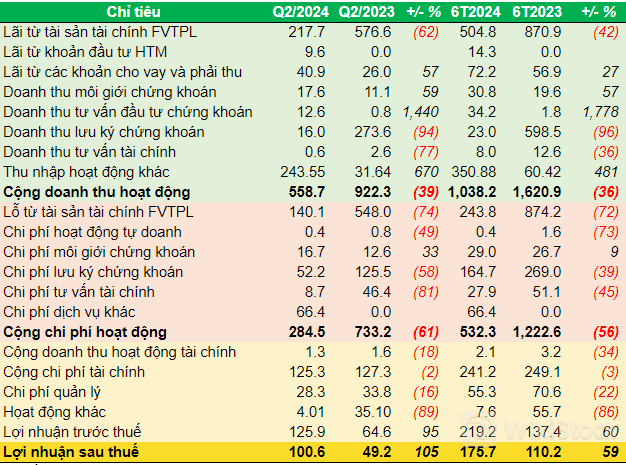 Đáng chú ý, hoạt động cho vay ký quỹ cho thấy sự tăng trưởng mạnh mẽ, thể hiện ở quy mô các khoản cho vay đạt 2,306 tỷ đồng, tăng 111% so với đầu năm. Nhờ vậy, lãi từ các khoản cho vay và phải thu trong quý 2 tăng hơn 57% so với cùng kỳ, đạt gần 41 tỷ đồng.