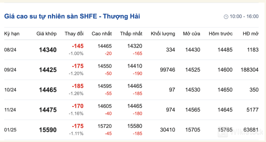 Trên Sàn giao dịch hàng hóa tương lai Thượng Hải (SHFE), giá cao su RSS3 giao kỳ hạn tháng 8/2024 giảm 1% ở mức 14.340 nhân dân tệ/tấn.