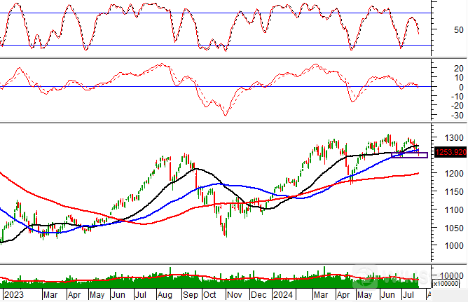 Hiện tại, VN-Index đang test lại đáy cũ tháng 6/2024 (tương đương vùng 1,240-1,250 điểm) trong bối cảnh chỉ báo Stochastic Oscillator tiếp tục hướng đi xuống sau khi cho tín hiệu bán trước đó. Nếu tín hiệu bán dược duy trì và chỉ số xuyên thủng vùng hỗ trợ này thì rủi ro điều chỉnh sẽ tăng cao trong các phiên tới.
