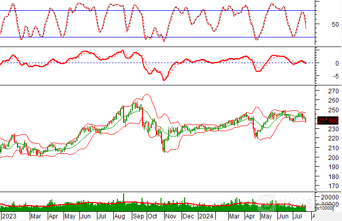 Bên cạnh đó, giá cổ phiếu đang quay về test lại đường Middle của dải Bollinger Bands trong bối cảnh chỉ báo MACD cho tín hiệu bán trở lại. Nếu tín hiệu bán được duy trì và giá cổ phiếu tiếp tục xuyên thủng vùng hỗ trợ này thì rủi ro điều chỉnh sẽ tăng cao trong các phiên tới.