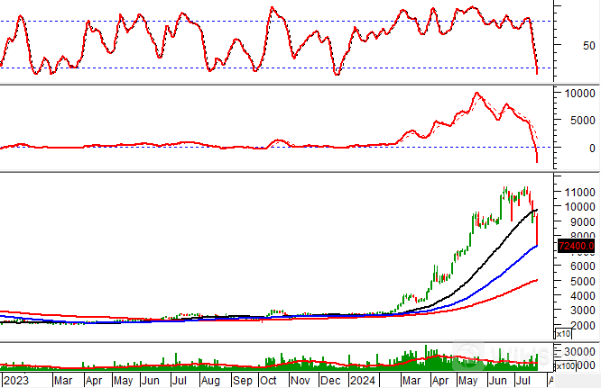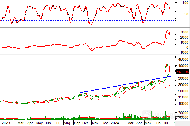 Trong phiên sáng 23/07/2024, VGI giảm kịch sàn đồng thời xuất hiện mẫu hình nến Black Marubozu cùng với khối lượng giao dịch vượt mức trung bình 20 phiên cho thấy tâm lý nhà đầu tư đang khá hoảng loạn.