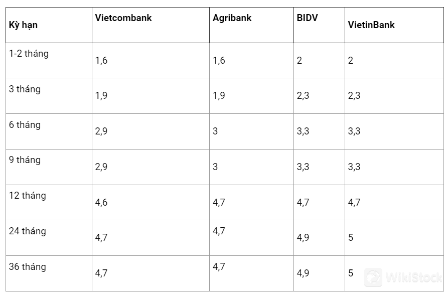 Đối với kỳ hạn 1-2 tháng, Vietcombank và Agribank trả lãi 1,6%/năm. BIDV và VietinBank áp dụng mức lãi suất là 2%/năm.