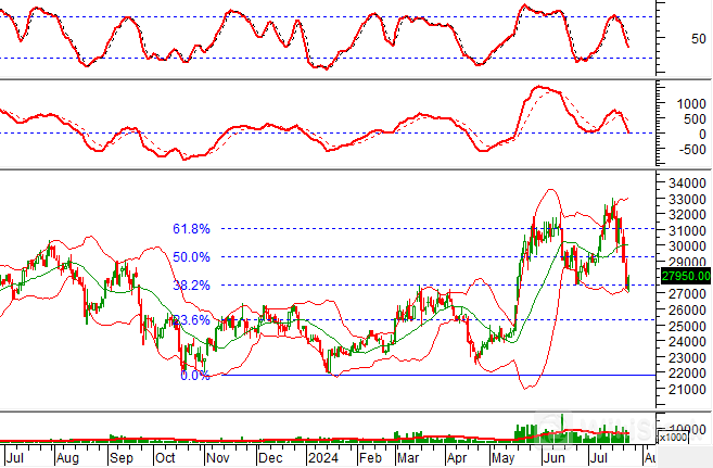 Bên cạnh đó, giá cổ phiếu chững lại đà rơi tại ngưỡng Fibonacci Projection 38.2% (tương đương vùng 27,000-28,000) trong bối cảnh chỉ báo Stochastic Oscillator tiếp tục hướng đi xuống sau khi cho tín hiệu bán trước đó. Nếu yếu tố này được cải thiện và giá cổ phiếu không phá vỡ vùng hỗ trợ này thì kịch bản phục hồi có thể quay lại trong các phiên tới.