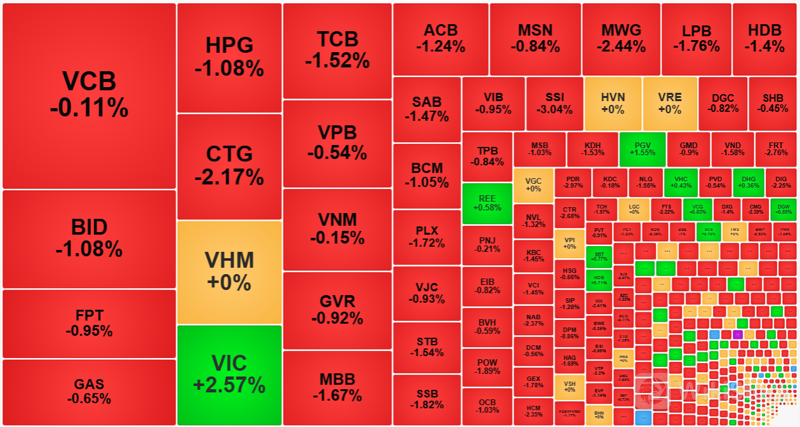 Trong 339 cổ phiếu đang đỏ ở HoSE, có 157 mã giảm quá 1% so với tham chiếu, chiếm 46% số cổ phiếu có giao dịch. Thanh khoản nhóm này chiếm tới 57,1% tổng giá trị khớp cả sàn. Nhóm blue-chips như SSI, MBB, MWG, STB, HPG… chiếm toàn bộ các cổ phiếu thanh khoản cỡ trên trăm tỷ đồng. Dù vậy các mã vừa và nhỏ cũng giảm khá mạnh như VIX, DIG, VCI, TCH, TCM, HCM, PDR… Chỉ số Midcap chốt giảm 1,16%, Smallcap giảm 1,04% so với tham chiếu.