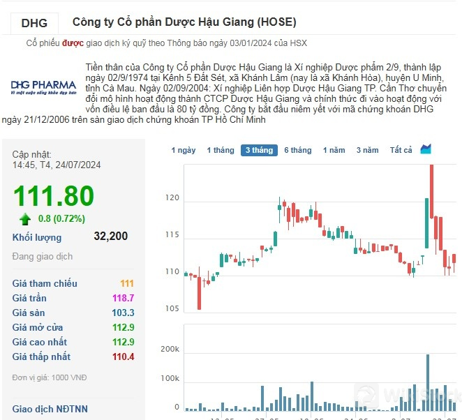 Phiên 24/7, thị giá cổ phiếu DHG của Công ty cổ phần Dược Hậu Giang bất ngờ tăng trở lại lên mức 111.800 đồng/cp sau chuỗi giảm đỏ 5 phiên liên tiếp. Giá trị vốn hóa của Dược Hậu Giang tương ứng đạt hơn 14.600 tỷ đồng và là doanh nghiệp dược lớn nhất sàn chứng khoán.