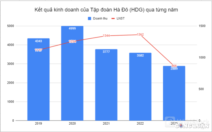 Về doanh thu, trong giai đoạn 2020-2023, doanh thu Tập đoàn Hà Đô liên tục sụt giảm. Cụ thể, doanh thu HDG đạt đỉnh điểm 4.999 tỷ đồng tại năm 2020. Kể từ đó trở đi, doanh thu của Hà Đô chỉ giảm không tăng.