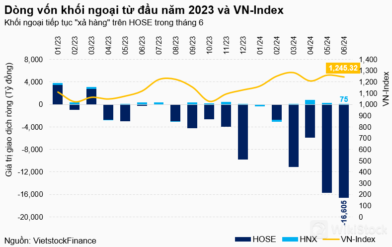 Khối ngoại tiếp tục gây chú ý khi bán ròng ngày càng mạnh. Đỉnh điểm là lên đến gần 16,605 tỷ đồng trong tháng 6 trên HOSE, đưa mức bán ròng lũy kế nửa đầu năm lên gần 52,134 tỷ đồng, tiến gần tới giá trị “khủng” hơn 56,208 tỷ đồng của năm 2021.