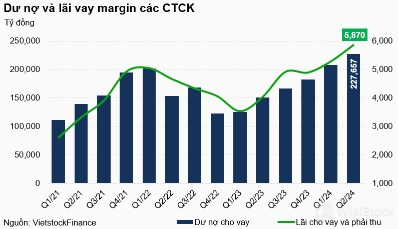 Trong bối cảnh đó, dư nợ cho vay (chủ yếu là cho vay margin) của các CTCK lại tiếp tục được nâng lên cột mốc mới - gần 227,657 tỷ đồng, tăng 9% so với thời điểm cuối quý 1 và tăng 25% so với đầu năm nay.