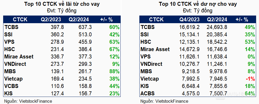 Đối với top 10 CTCK dẫn đầu về quy mô lãi từ cho vay, TCBS cũng dẫn đầu với mức lãi hơn 637 tỷ đồng, tăng 60% so với cùng kỳ năm trước. Trong danh sách này, MBS là CTCK có tốc độ tăng lãi vay cao nhất, lên đến 88% so với cùng kỳ, đạt gần 261 tỷ đồng.