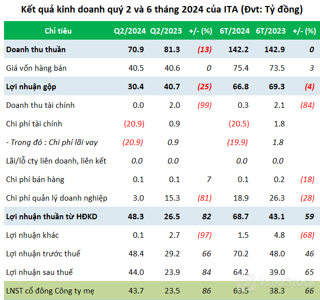 Quý 2/2024, ITA ghi nhận doanh thu thuần gần 71 tỷ đồng, giảm 13% so với cùng kỳ. Sau khấu trừ giá vốn, lợi nhuận gộp giảm 25% còn hơn 30 tỷ đồng.