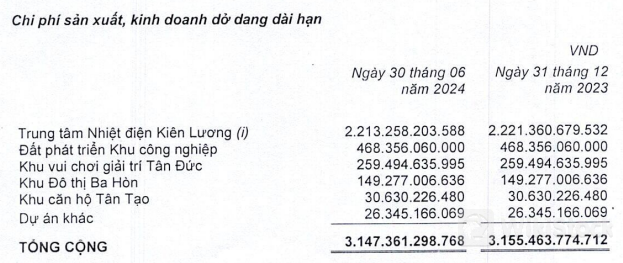 Chi phí sản xuất, kinh doanh dở dang dài hạn cũng không đổi ở mức 3,147 tỷ đồng, chiếm 26% tổng nguồn vốn, ghi nhận phần lớn tại dự án trung tâm Nhiệt điện Kiên Lương hơn 2,213 tỷ đồng.