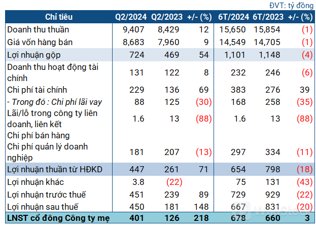 Trong quý 2, POW đạt 9.4 ngàn tỷ đồng doanh thu thuần, tăng 12% so với cùng kỳ. Giá vốn tăng ở mức thấp hơn, chỉ 9%. Sau khấu trừ, lãi gộp đạt 724 tỷ đồng, tăng mạnh 54%. Theo giải trình, mức tăng này đến từ hoạt động sản xuất kinh doanh chính của công ty mẹ, và phần lợi nhuận gia tăng từ Nhà máy Thủy điện Đăkđrinh.