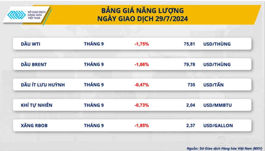 Theo Sở Giao dịch hàng hóa Việt Nam (MXV), giá dầu thế giới tiếp tục chịu áp lực bán mạnh mẽ dưới sức ép từ nhu cầu tiêu thụ kém tích cực. Chốt phiên, giá dầu WTI giảm 1,75% xuống 75,81 USD/thùng, dầu Brent giảm 1,66% về mức 79,78 USD/thùng.