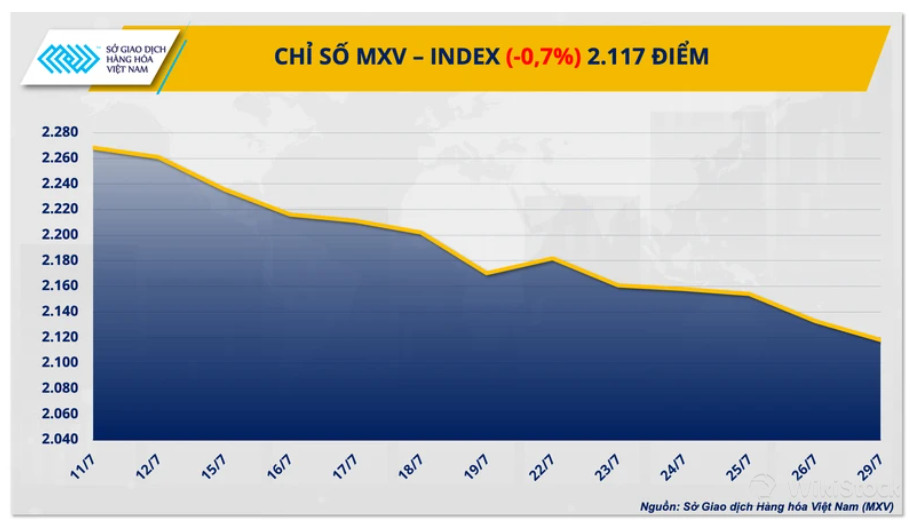 Theo MXV, lực bán tiếp tục chiếm ưu thế trong ngày giao dịch đầu tuần (29/7). Trên thị trường kim loại và năng lượng, nhiều mặt hàng đồng loạt giảm giá kéo chỉ số MXV-Index rơi tiếp 0,7% xuống còn 2.117 điểm, mức thấp nhất trong vòng hơn 4 tháng qua.