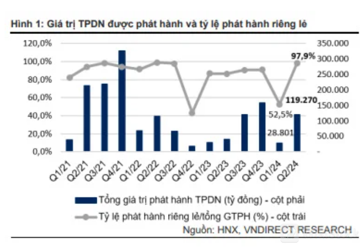 Các đợt phát hành riêng lẻ có tổng giá trị đạt 116.770 tỷ đồng, chiếm 97,9% tổng giá trị phát hành. Hoạt động phát hành TPDN riêng lẻ đã có sự phục hồi mạnh trong quý II/2024, với tổng giá trị phát hành cao gấp 7,7 lần so với quý I/2024 và tăng 232,8% so với cùng kỳ năm trước. Các chuyên gia VNDirect nhìn nhận sự phục hồi của hoạt động phát hành TPDN riêng lẻ trong quý II/2024 đến từ sự gia tăng phát hành trở lại của nhóm ngân hàng.