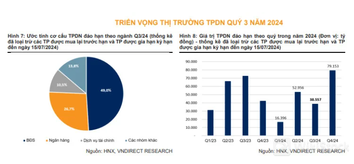 VNDirect ước tính trong quý III/2024 sẽ có khoảng hơn 38,5 nghìn tỷ đồng trái phiếu doanh nghiệp (TPDN) riêng lẻ đáo hạn, giảm 27,2% so với quý II/2024. Nhóm bất động sản có tỷ trọng lớn nhất chiếm 49% tổng giá trị trái phiếu đáo hạn.