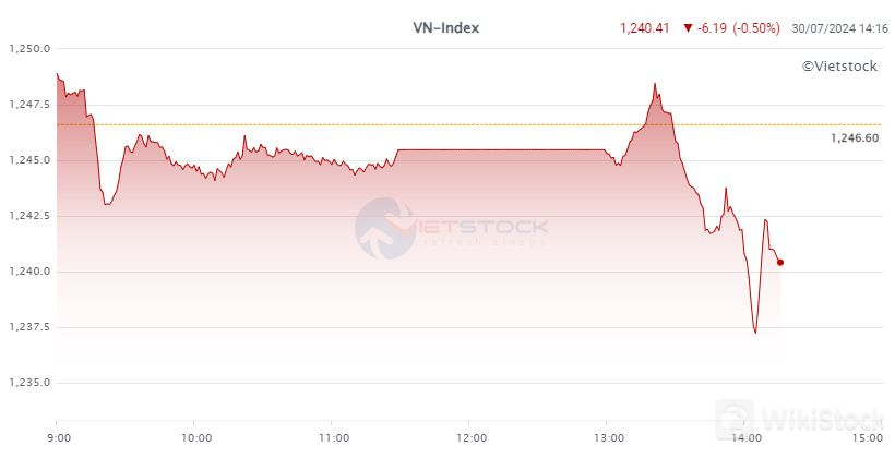 VN-Index đóng cửa phiên 30/07 tại mốc 1,245.06 điểm, giảm 1.54 điểm; HNX 235.87 điểm, giảm 1.65 điểm; UPCoM 95.24 điểm, giảm 0.22 điểm. Độ rộng thị trường vẫn nghiêng về phe giảm, với 444 cổ phiếu mang sắc đỏ, 28 cổ phiếu giảm sàn, trong khi chỉ 269 cổ phiếu mang sắc xanh và 23 cổ phiếu tăng trần. Một số cổ phiếu giảm sàn đáng chú ý hôm nay là DBC, LIG, CMX, HBC, SMC,…bên cạnh nhiều cổ phiếu vốn thu hút nhiều sự quan tâm khác cũng giảm mạnh như VIX, MBB, HNG…