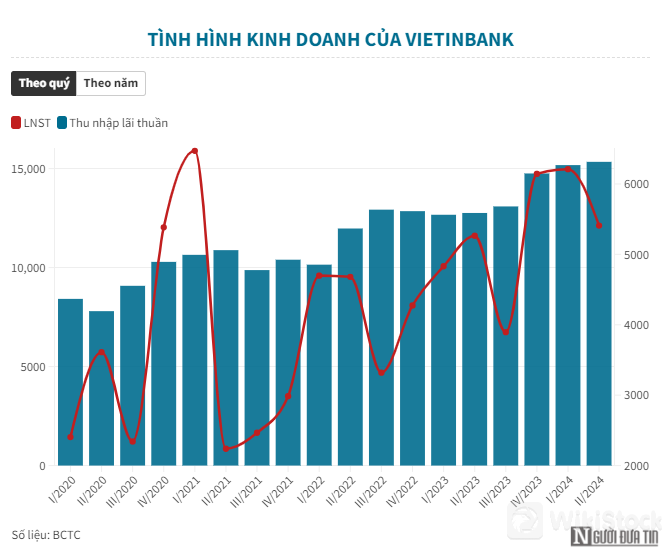 Kết thúc quý II/2024, nguồn thu chính là thu nhập lãi thuần của VietinBank đạt gần 15.339 tỷ đồng, tăng 20% so với cùng kỳ năm trước.