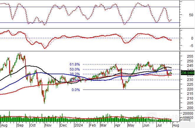 Bên cạnh đó, HNX-Index đang test lại ngưỡng Fibonacci Projection 38.2% (tương đương vùng 233-237 điểm) trong bối cảnh chỉ báo MACD tiếp tục hướng đi xuống sau khi cho tín hiệu bán trước đó. Nếu tín hiệu bán được duy trì và chỉ số tiếp tục xuyên thủng vùng hỗ trợ này thì rủi ro điều chỉnh sẽ tăng cao trong các phiên tới.