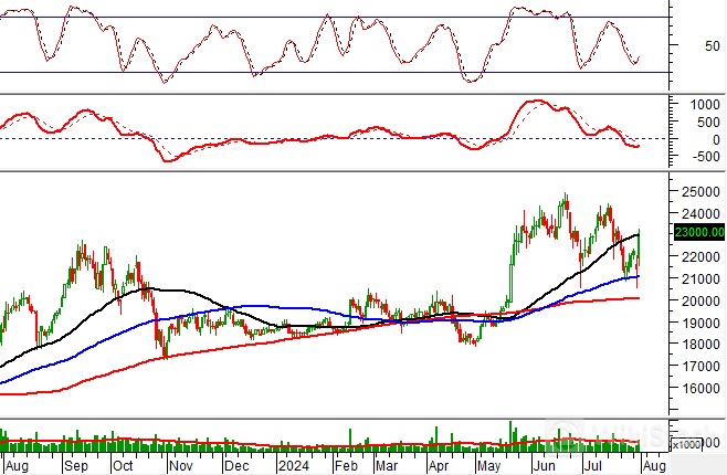 Trong phiên sáng 31/07/2024, BID tăng giá đồng thời xuất hiện mẫu hình nến White Marubozu cùng với khối lượng giao dịch có sự gia tăng mạnh trong phiên sáng và người viết dự kiến sẽ vượt mức trung bình 20 phiên cho thấy tâm lý lạc quan của các nhà đầu tư.