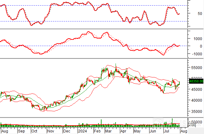Bên cạnh đó, giá cổ phiếu bật tăng sau khi test thành công đường Middle của Bollinger Bands trong bối cảnh chỉ báo MACD cho tín hiệu mua trở lại càng củng cố thêm sức mạnh cho xu hướng hiện tại của cổ phiếu.