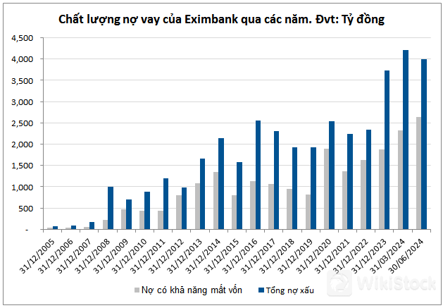 Trong giai đoạn rối ren thượng tầng 2019-2021, nợ có khả năng mất vốn (nợ nhóm 5) của Eximbank cũng dâng cao. Tại thời điểm 31/12/2020, nợ nhóm 5 lên gần 2,000 tỷ đồng, gấp 2.3 lần so với cuối năm 2019. Tổng nợ xấu cũng tăng hơn 31%, lên hơn 2,500 tỷ đồng vào cuối năm 2020, kéo tỷ lệ nợ xấu trên dư nợ cho vay vượt lên mức 2.5%.