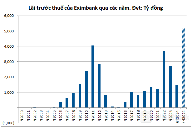 Khép lại 6 tháng đầu năm 2024, Eximbank mới thực hiện được hơn 28% mục tiêu lợi nhuận năm, với lãi trước thuế tăng nhẹ 5% so với cùng kỳ năm trước, đạt hơn 1,474 tỷ đồng. Trong đó thu nhập lãi thuần tăng 23% lên 2,870 tỷ đồng trong khi trích lập dự phòng rủi ro tín dụng cao, tăng 86% so cùng kỳ năm trước.