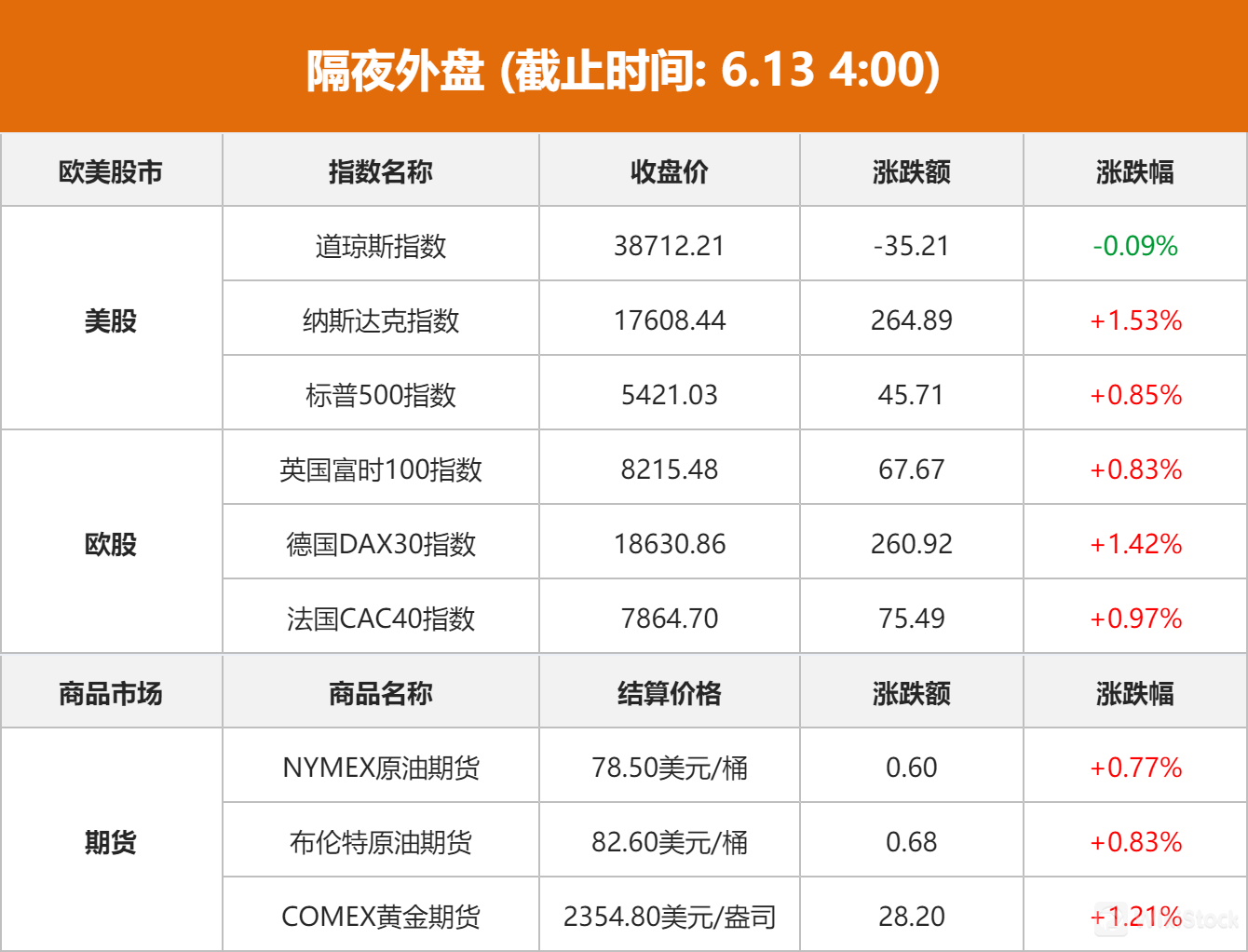 【隔夜外盘】1、美联储宣布维持利率不变,多数联邦公开市场委员会成员预计今年内或最多实施一次降息;2、美股涨跌不一,纳指、标普续创历史新高;3、大型科技股多数上涨,特斯拉、英伟达涨超3%,英伟达、苹果股价均创历史新高。