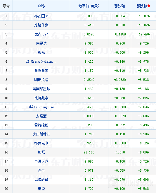 上涨股当中,百济神州涨0.37%,富途控股涨2.67%,哔哩哔哩涨6.33%,小鹏汽车涨3.34%,WSP控股涨0.93%。下跌股当中,台积电跌0.81%,拼多多跌0.19%,阿里巴巴跌0.91%,网易跌1.97%,京东跌2.02%,携程跌3.26%,百度跌0.25%,中华电信跌2.51%,日月光半导体跌1.36%,腾讯音乐跌0.36%,联电跌0.67%,贝壳跌0.58%,理想汽车跌0.89%,中通跌0.61%,新东方跌0.89%,华住酒店集团跌0.21%,满帮跌0.68%,蔚来跌0.69%,BOSS直聘跌3.71%,唯品会跌0.69%,名创优品跌0.96%,极氪跌6.08%,爱奇艺跌2.77%,汽车之家跌3.83%。