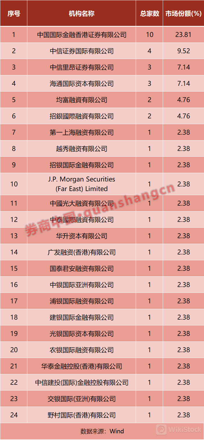 保荐机构排行榜中,中金公司香港以10家IPO、23.81%的市场份额仍然位居榜首;中信证券国际以4家IPO、9.52%的市场份额居第二位,若合并中信里昂则共有7家IPO、16.66%的市场份额;海通国际保荐了3家IPO、7.14%的市场份额居第三。
