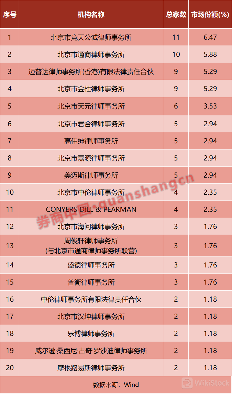 律师事务所排行榜中,IPO业务市场竞争更加激烈,相对保荐人和会计所市场份额更加分散。其中,北京竞天公诚律所以10家IPO,6.47%的市场份额居首;北京通商律所以10家IPO,5.88%的市场份额居第二; 迈普达(香港)和北京金杜律所皆以9家IPO,5.29%的市场份额居第三。