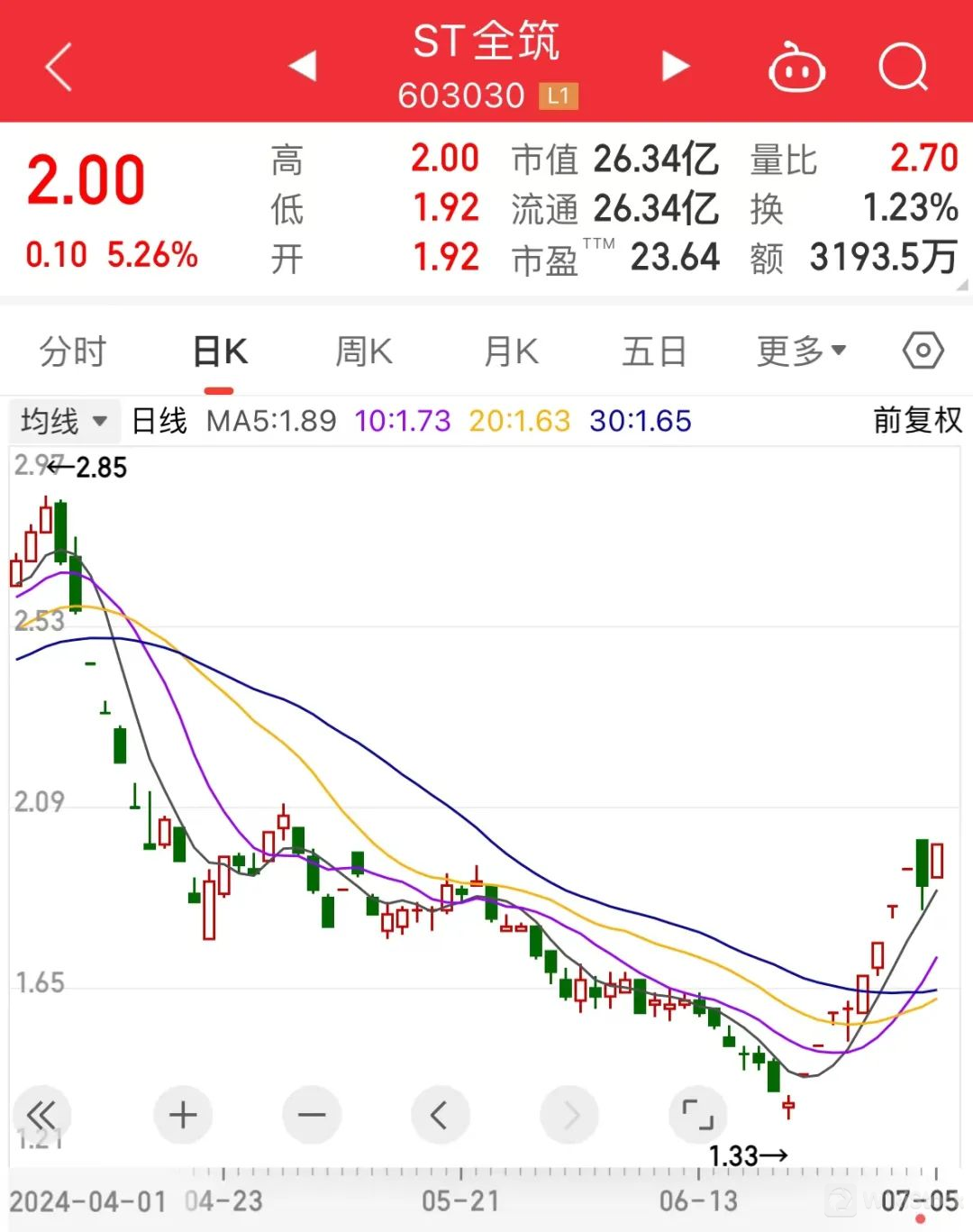 ST全筑(603030)6月24日以来,10个交易日收获了8个涨停板。公司日前发布公告,截至2024年7月4日,部分高管累计增持公司股份286.4万股,增持金额合计为501.42万元。另外,公司发布半年度业绩快报,二季度业绩明显向好,实现归母净利润1656.98万元,相较于一季度环比增长162.69%。