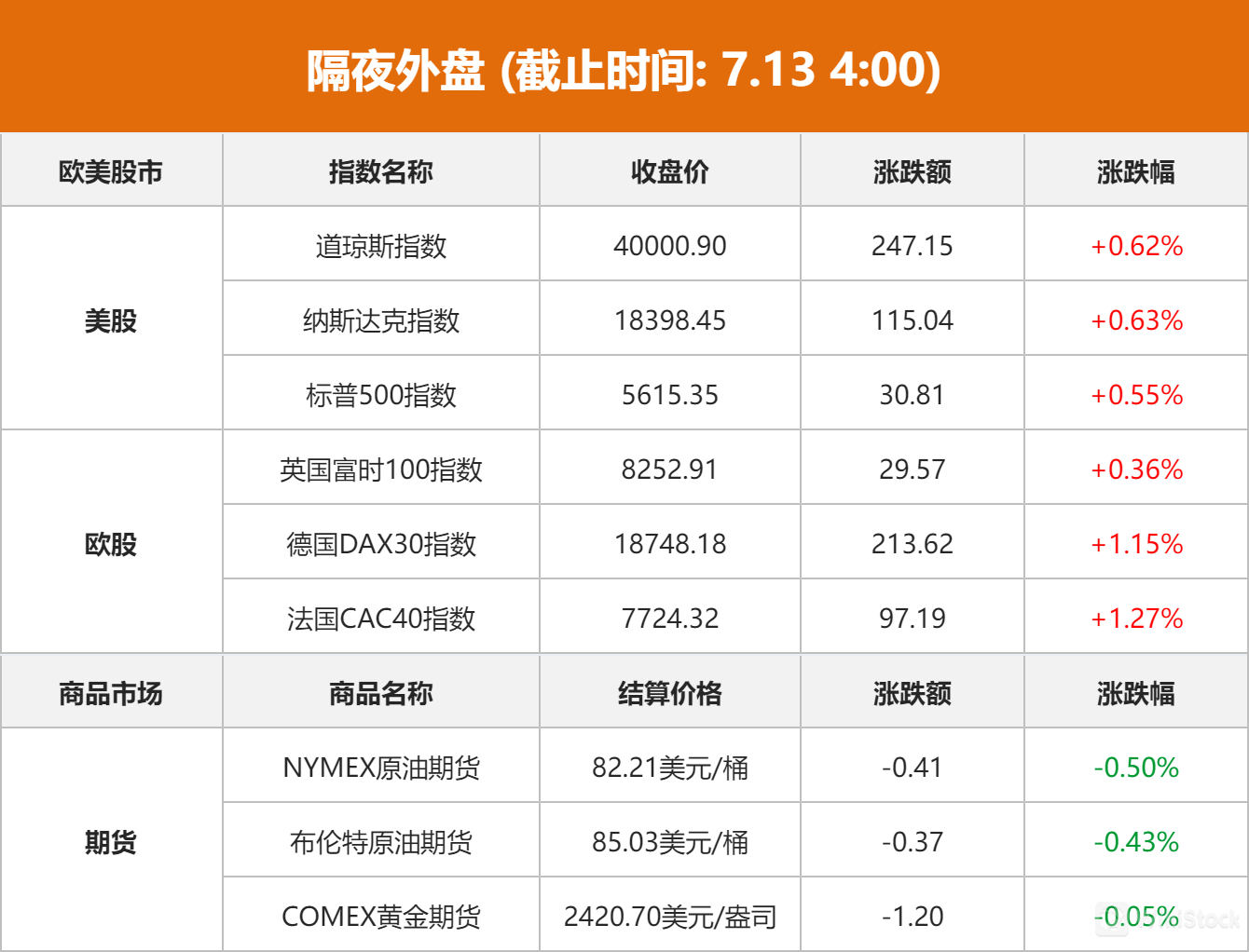 1、美股收涨,道指涨0.62%,纳指涨0.63%,标普涨0.55%。道指创盘中历史新高,收于40000点上方。2、美股财报季揭幕,摩根大通、花旗、富国银行公布业绩后集体收跌。3、大型科技股涨跌不一,特斯拉涨近3%,英伟达、苹果涨超1%,Meta跌超2%。