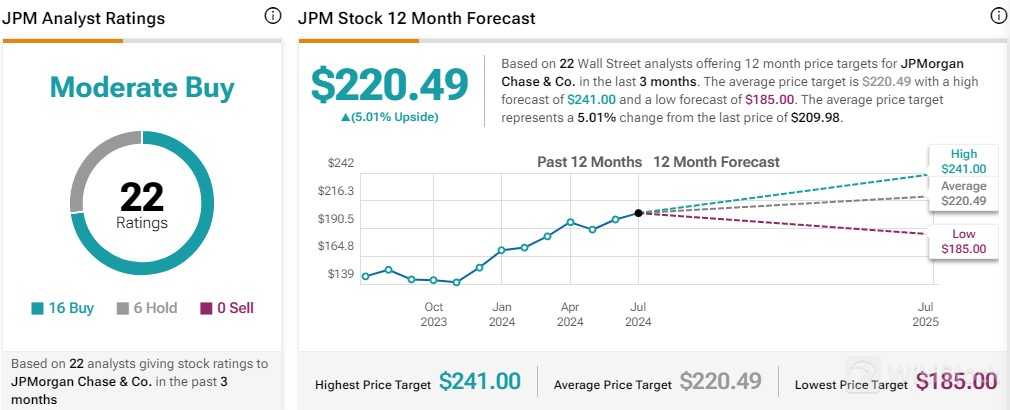 根据TipRanks的数据,华尔街分析师予摩根大通“适度买入”评级,平均目标价为220.49美元,较当前水平高出5%。