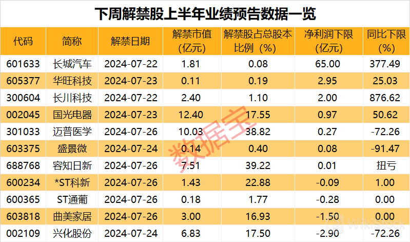 下周解禁的个股中,11只个股已发布上半年业绩预告,其中6只个股业绩预喜。