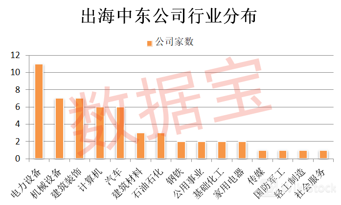 据证券时报·数据宝不完全统计,A股市场上,布局中东地区业务的公司超过50家。分行业看,这些公司主要分布于电力设备、机械设备、建筑装饰、计算机、汽车行业。其中电力设备公司数量最多,达到11家。