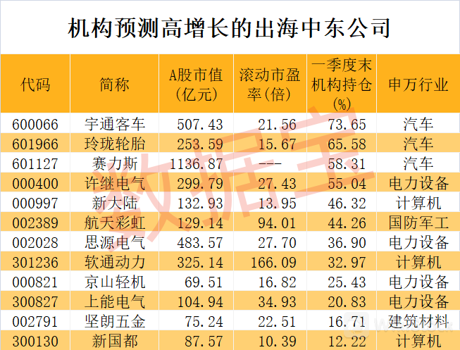 这些机构一致看好的12家公司也获得机构扎堆重仓。据数据宝统计,今年一季度末,4家公司获机构持仓占流通股比例超过50%,分别是宇通客车、玲珑轮胎、赛力斯、许继电气。