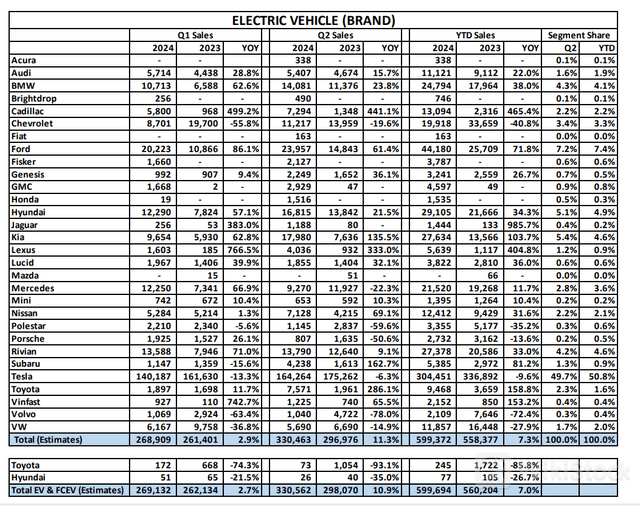 然而,由于竞争的影响,特斯拉第二季度的美国电动汽车市场份额首次跌破50%的门槛,降至49.7%。尽管特斯拉销量下滑,但纵观第二季度全美纯电市场,整体同比增长了11.3%,虽然与上年同期相比,增速放缓,但上升趋势也说明美国消费市场对电动汽车仍有一定的需求。
