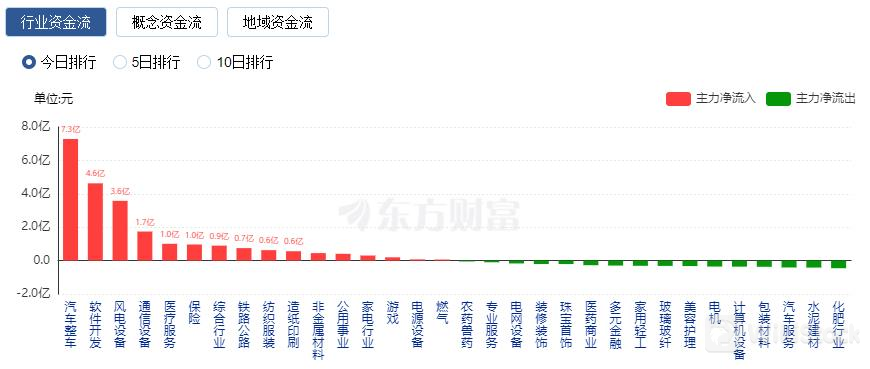 行业资金方面,截至收盘,汽车整车、软件开发、风电设备等净流入排名靠前,其中汽车整车净流入7.28亿。