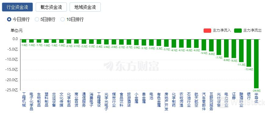 净流出方面,半导体、银行、酿酒行业等净流出排名靠前,其中半导体净流出24.00亿元。