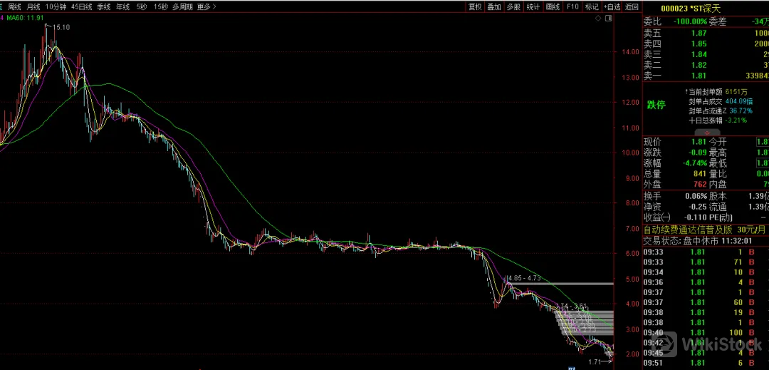 【见证历史 A股公司首例市值退市锁定】 *ST深天股价7月22日再度跌停,公司最新总市值仅为2.64亿元。根据测算,即便后续两个交易日公司收盘价连续涨停,其股票市值仍将低于3亿元,这样公司股票收盘市值将连续20个交易日低于3亿元,从而触发市值退市规定。若*ST深天因此退市,将成为史上首个A股公司市值退市案例。