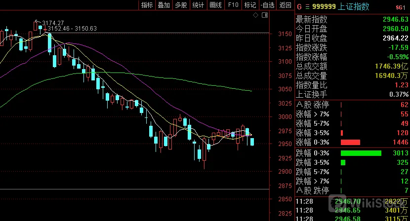 今上午大盘低开4点2960点即为最高点,探底2945点,午前收2946点。上证50、沪深300、上证指数、深成指、创业板、科创板、中证500、中证1000跌0.58%、1.05%、0.59%、1.59%、1.55%、238%、1.63%、1.17%。个股涨跌比为1640:3377,涨跌停比40:2。两市半日成交额为3796亿,与上个交易日缩量464亿。