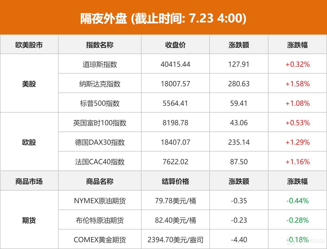 商品市场:国际油价下跌。截至当天收盘,纽约商品交易所9月交货的轻质原油期货价格下跌35美分,收于每桶79.78美元,跌幅为0.44%;9月交货的伦敦布伦特原油期货价格下跌23美分,收于每桶82.40美元,跌幅为0.28%。国际金价下跌,截至当天收盘,COMEX黄金期货主力合约下跌4.4美元/盎司,跌幅0.18%,报2394.7美元/盎司。