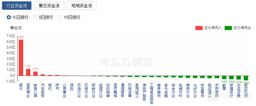 行业资金方面,截至收盘,银行、医药商业、铁路公路等净流入排名靠前,其中银行净流入6.40亿。