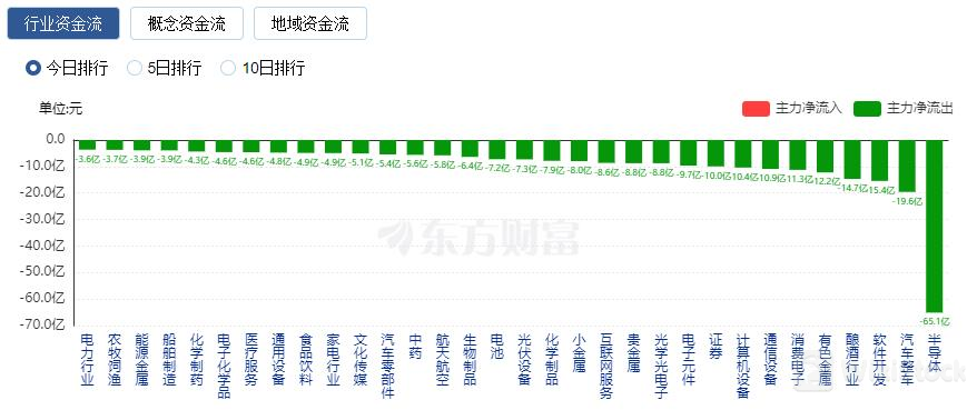 净流出方面,半导体、汽车整车、软件开发等净流出排名靠前,其中半导体净流出65.12亿元。