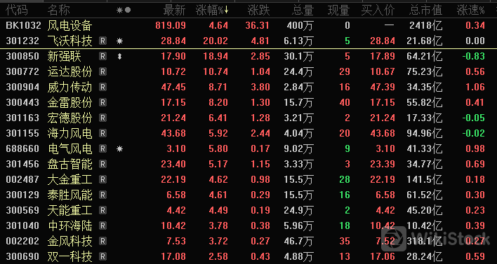 风电板块全线走强,新强联(300850)一度20%涨停,运达股份(300772)涨超10%,川润股份(002272)涨停,威力传动(300904)、金雷股份(300443)、海力风电(301155)等创业板个股涨幅居前。近日,国家能源招标网发布《国电电力(600795)广西风电开发有限公司海上风电竞争性配置技术服务公开招标项目招标公告》。此外,国常会研究加力支持大规模设备更新和消费品以旧换新政策措施。