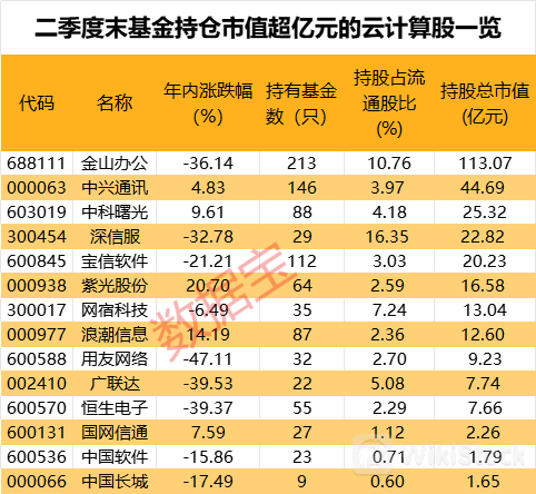 据证券时报·数据宝统计,截至二季度末,金山办公、中兴通讯(000063)、中科曙光(603019)、深信服(300454)、宝信软件(600845)、紫光股份(000938)、网宿科技(300017)、浪潮信息获基金重仓持股超10亿元,用友网络(600588)、广联达(002410)、恒生电子(600570)等持仓市值也超亿元。