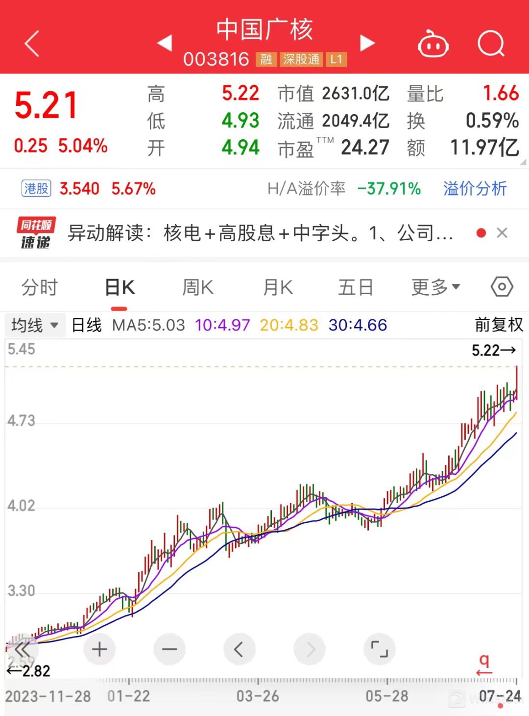 7月24日,中国广核(003816)大涨5.04%,股价再创历史新高,A股市值首次突破2000亿元,今年以来累计涨幅达70.57%,远远跑赢同期上证指数。